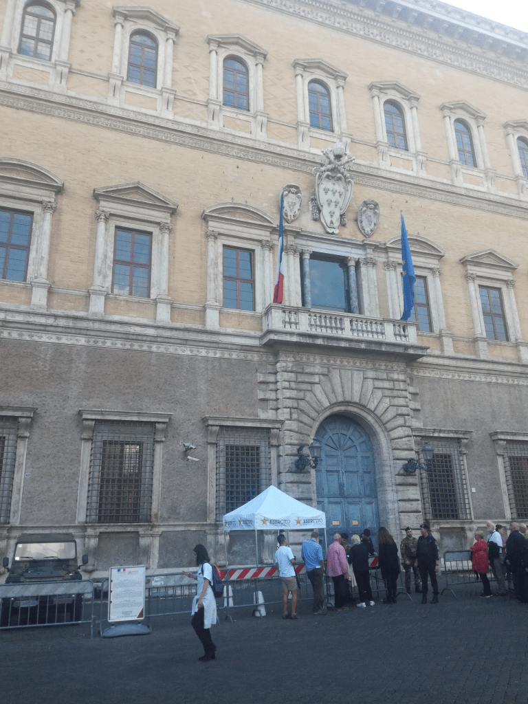 École française sijaitsee jykeväseinäisessä Palazzo Farnesessa, jossa on myös Ranskan suurlähetystö. Puolustusjärjestelyt on selkeästi laadittu raskaasti aseistettujen terroristien rynnäkköä silmällä pitäen. Portin edessä on yksityinen turvapalvelu, karabineerit ja Italian armeija rynnäkkökivääreineen. En ole kysynyt, ovatko kovat piipuissa, mutta todennäköisesti ainakin lippaissa.