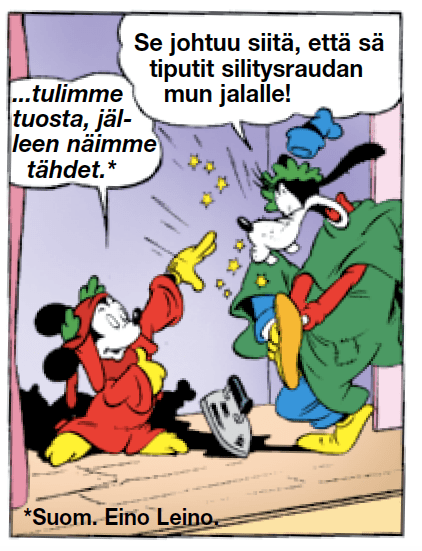 Mutta jos jotain menetetäänkin, suomentajat onnistuvat vastapainoksi nostamaan käännöksen komiikkakertoimia toisaalla muuntelemalla Leinon säkeitä. Näin Helvetin portin kyltti ”Lasciate ogni speranza, voi ch’entrate” (If III, 9) kääntyy Leinon version “Ken tästä käy, saa kaiken toivon heittää” sijasta narikkaohjeistukseksi ”Ken tästä käy, saa palttoonsa heittää!” (s. 178). Mikki Hiiren Inferno ei siis parodioi onnistuneesti vain Dantea, vaan myös Leinoa. Kun kehyskertomus on vielä kirjoitettu sekä runomittaan että riimein, on helppo yhtyä S. Santikon ylistävään arvioon suomennoksesta.