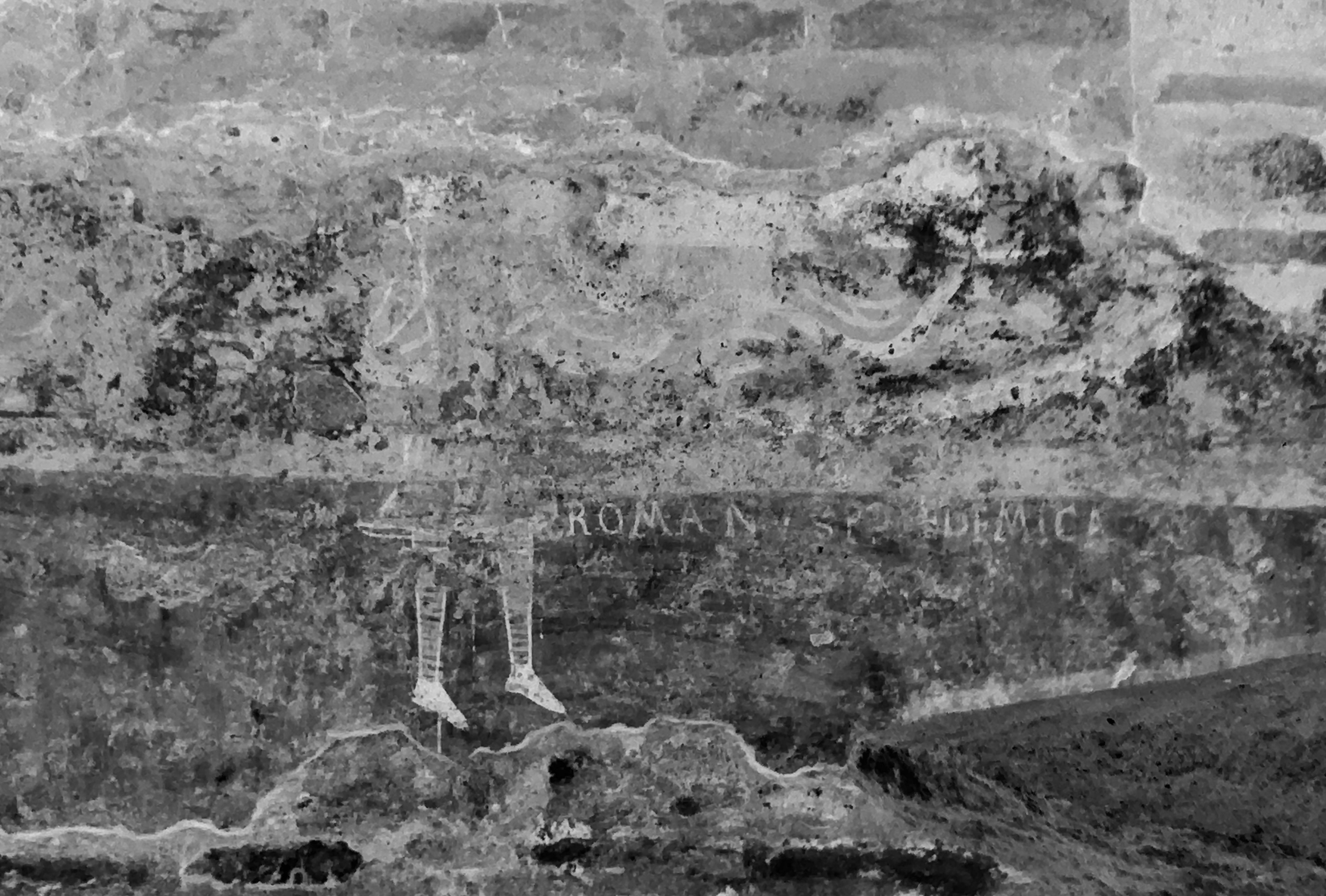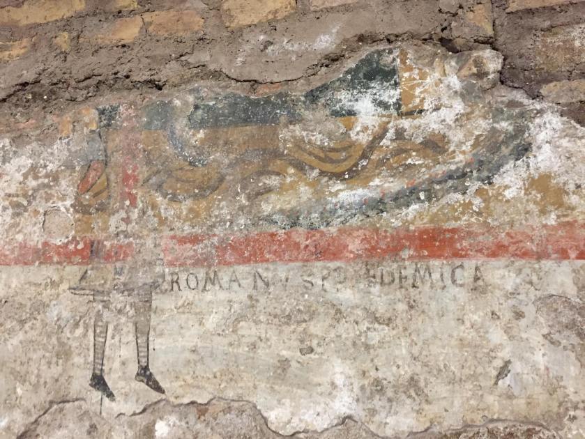 De bevarade medeltida freskmålningarna i den gamla San Crisogonokyrkan avbildar bland annat den tidigare nämnde 300-talspåven Sylvester med helgonen Pantaleon (samtida med Chrysogonos) och Benedikt. På en av målningarna har gjorts ett eller flera senare tillägg: en teckning av en mansfigur med en stav i höger hand, varav nedre halvan av kroppen är bevarad, med en påskrift, som här tolkas som ”ROMANUS PP I[N] [A]EDE MICA”: ”Romanus Papa in Aede Mica [Aurea]”, ungefär ”påven Romanus i Mica Aurea-byggnaden”, det vill säga i San Crisogonokyrkan. Kan detta vara en referens till Romanus, påve från augusti till november år 897, en minst sagt turbulent period i påvedömets historia? Och vem är den avbildade figuren? Är teckningen en slags påvekarikatyr? Ovanför ”PP” syns vad som eventuellt skulle vara ett tillagt kors – alternativt bokstäverna ”NE”. Det är en öppen fråga om påskriften gjordes samtidigt som teckningen eller det möjliga tillägget på raden ovan.