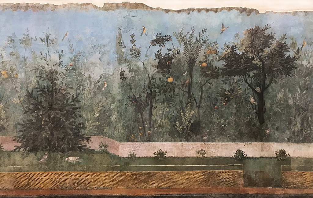 Keisari Augustuksen aikana Roomassa yleistyivät seinämaalauksissa puutarhojen kuvaaminen. Rooman ulkopuolella Prima Portassa sijainneen Livian huvilan maanalaisen huoneen seinämaalaukset ovat esillä Palazzo Massimossa. Maalaukset kuvaavat eräänlaista paratiisia, jossa on villiä luontoa ja istutuksia mutta myös lintuja. Seinämaalauksessa kuvataan useita rajoja rakennetun ympäristön, puutarhan ja luonnon välillä. Teoksen sisäinen tila jakautuu erilaisiin osiin. Katsoja seisoo rakennetussa ympäristössä, jota lähinnä ovat puutarhan rakenteet, istutetut puut ja kasvit. Maalauksen etualan taustaksi muodostuu kuvattujen kasvien ja puiden vihreä seinämä sekä sininen taivas. Seinämaalauksesta on tunnistettu iiriksiä, ruusuja, unikkoja ja orvokkeja. Maalaukseen on kuvattu kuusi, mänty, tammi, sypressi, palmu ja granaattiomenapuu. Myrtti, muratti, saniainen ja laakeripuu ovat myös teokseen ikuistettujen puiden, kukkien ja kasvien joukossa.
