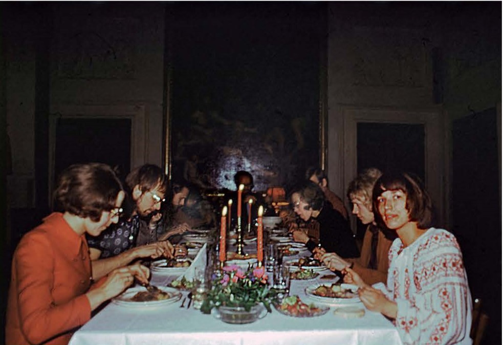 Ensimmäinen kevätpäivä ja huippuonnellinen olo! Syömässä hanhenrintaa, kalkkunaa ja herkkusieniä perhepaikassa Ritva, Matti [Jääskeläinen], Dan [Holm] ja minä. Koettiin kevätmyrsky, pauhaa ulkona ja tuulee. Liliukset tarjosivat illallisen kurssilaisille. Syötiin piano nobilessa pitkän pöydän ympärillä, ”stukkojen ja puttojen seurassa”.