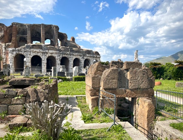 Retkeilijöiden toinen kohde Santa Maria Capua Veteressä oli sen suuri amfiteatteri, Anfiteatro Campano, joka rakennettiin Augustuksen ajalla ja on siten yksi vanhimmista roomalaisista kiviamfiteattereista. Jo aikaisemmin samaisella paikalla oli sijainnut vielä vanhempi areena, jolla kuuluisa gladiaattori Spartacus taisteli. Spartacuksen johtama orjakapina (73-59 eaa.) alkoi Capuan gladiaattorikoulusta. Amfiteatterin auringon paahtamissa raunioissa ei juuri turisteja näkynyt kahden sitkeän tutkijan lisäksi. Amfiteatterin ympäristö vaikutti kuitenkin olevan paikallisen arkielämän keskus: ympäröivässä suuressa puistossa oli ravintoloita ja kahviloita, leikkiviä lapsia ja ihmisiä pelaamassa ulkopelejä.