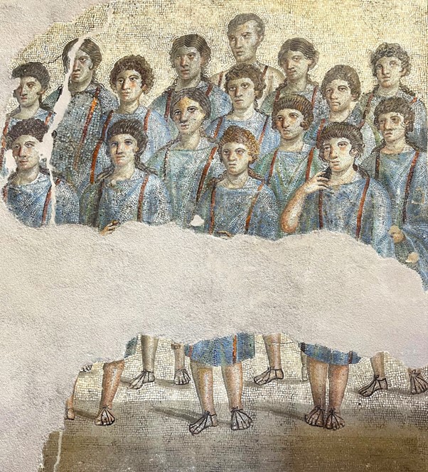 Coro sacro -mosaiikki vaati tarkempaa tarkastelua ja analyysia kuva-aiheen identifioimiseksi. Mosaiikki sijaitsi museossa hieman yllättäen toisessa kerroksessa, jossa nykytaidenäyttely peitti taakseen perusnäyttelyn esineistöä. Mosaiikin äärellä oli mahdollista vakuuttua siitä, että siinä esitetty joukko ei mitä luultavimmin koostunut lapsista eikä ainakaan tytöistä kuten museon kuvauksessa lukee. Lapset kuvattiin roomalaisessa taiteessa yleensä nimenomaan lapsenomaisina, lyhyinä ja tanakkoina hahmoina. Uskonnollisissa tehtävissä toimineiden lasten kerrotaan olleen lähes poikkeuksetta ylhäisöä, joiden lapset pukeutuivat julkisissa yhteyksissä vapaasyntyisyyttä merkitsevään toga praetextaan. Vapaasyntyisten lasten hiustyylit matkivat heidän vanhempiensa kampauksia. Pojilla hiukset olivat lyhyet ja siistit, kun taas tytöillä oli muodinmukaisia kampauksia, jotka muistuttivat heidän äitiensä tyylejä.